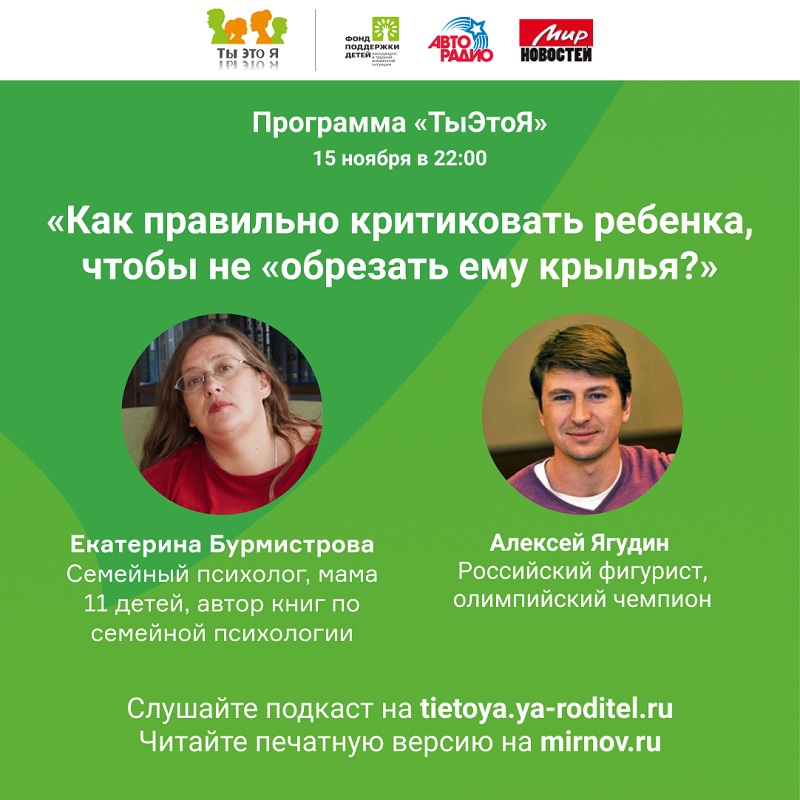 В выходные дни 21 и 22 ноября в 22.00 в эфире «Авторадио» ведущая цикла передач «ТыЭтоЯ» Татьяна Гордеева, известные детские психологи и звездные родители обсудят темы, волнующие всех родителей: как правильно критиковать ребенка, чтобы не задеть его чувства, и почему так важен родительский пример в воспитании собственных детей.